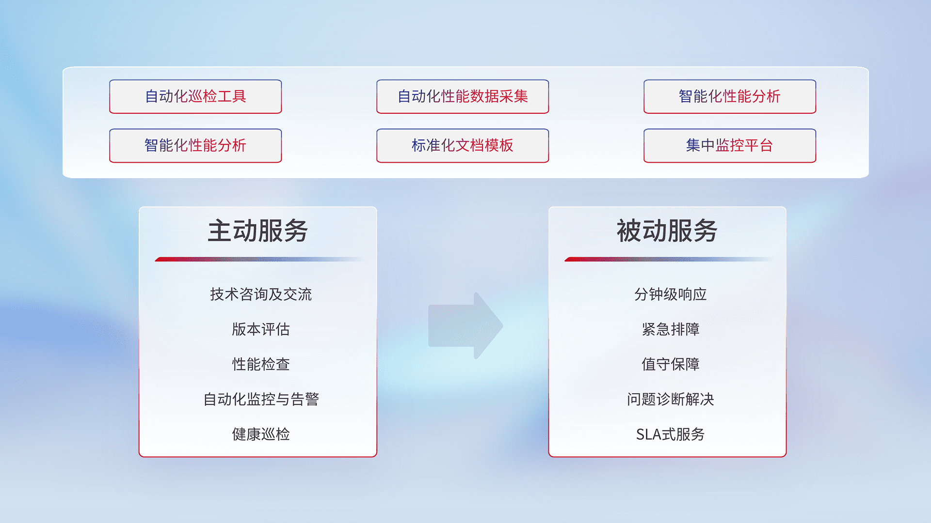 智能化工具和标准化文档,,,保障服务质量,,,,提供主动服务(包含技术咨询、、版本评估、、、、性能检查、、、、自动化监控与告警、、健康巡检)和被动服务包含(分钟级响应、、紧急排障、、、、值守保障、、问题诊断解决、、、、SLA服务)。。